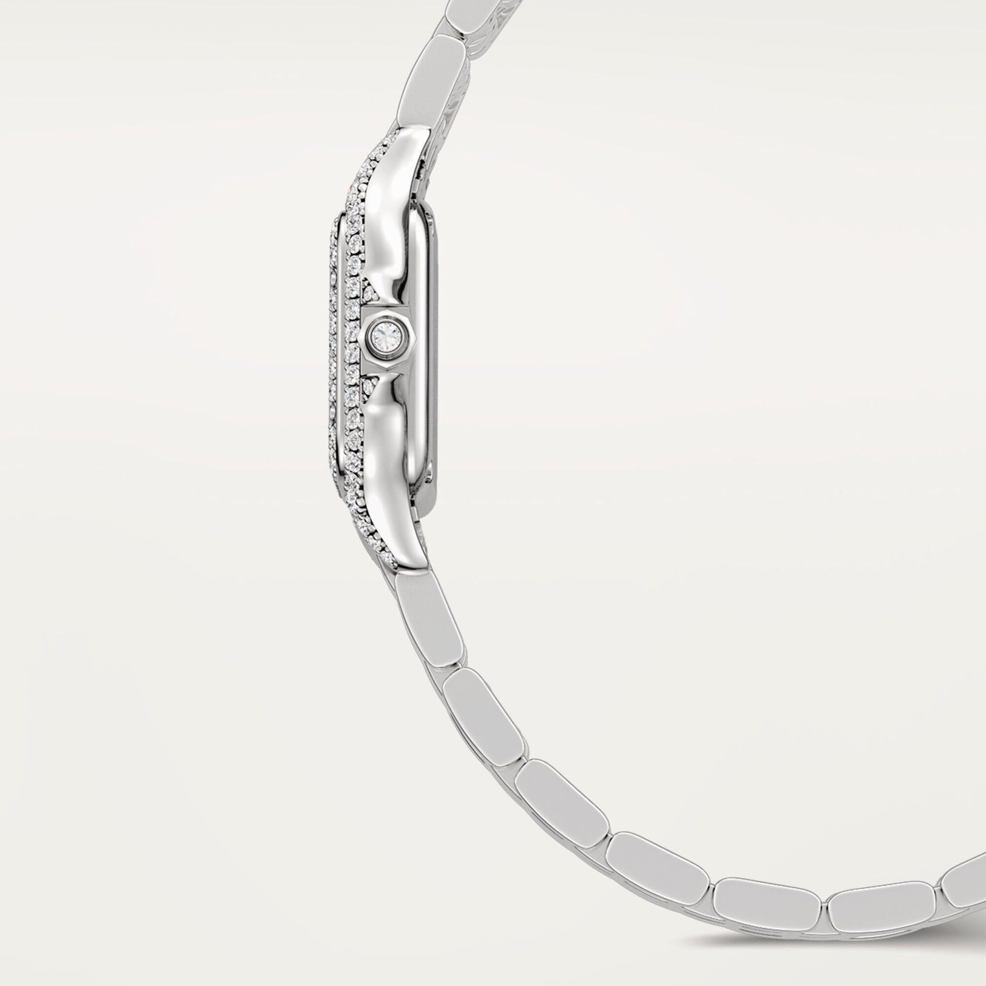 Panthère de Cartier watch, mini model, quartz movement. Rhodiumized white gold 750/1000 case set with brilliant-cut diamonds. Rhodiumized white gold 750/1000 octagonal crown set with a brilliant-cut diamond. Silver dial, blued-steel sword-shaped hands, sapphire crystal. Bracelet in rhodiumized white gold 750/1000. Case dimensions: 25 mm x 20 mm, thickness: 6 mm. Water-resistant up to 3 bar (approx. 30 meters/100 feet). Non-contractual photo (the length of the watch strap may vary slightly).