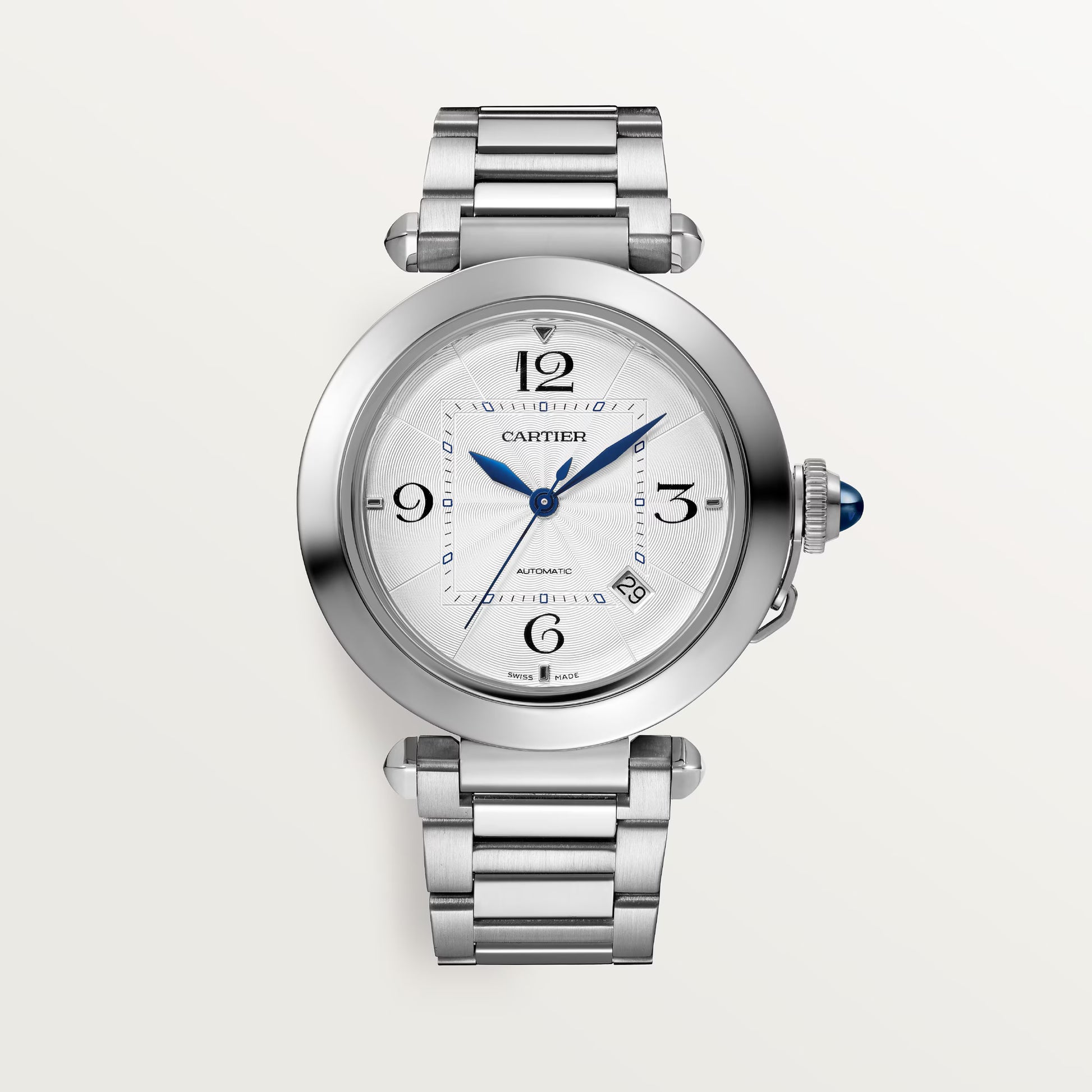 Pasha de Cartier watch, 41 mm, mechanical movement with automatic winding, caliber 1847 MC. Steel case, fluted crown cap and crown set with synthetic spinels, silver flinqué dial, blued-steel diamond-shaped hands, steel bracelet with "SmartLink" adjustment system, second dark gray alligator-skin strap, interchangeable steel deployant buckle. Both bracelets are fitted with the "QuickSwitch" interchangeability system. Case diameter: 41 mm, thickness: 9.55 mm. Water-resistant up to 10 bar (approx. 100 meters/100 feet).