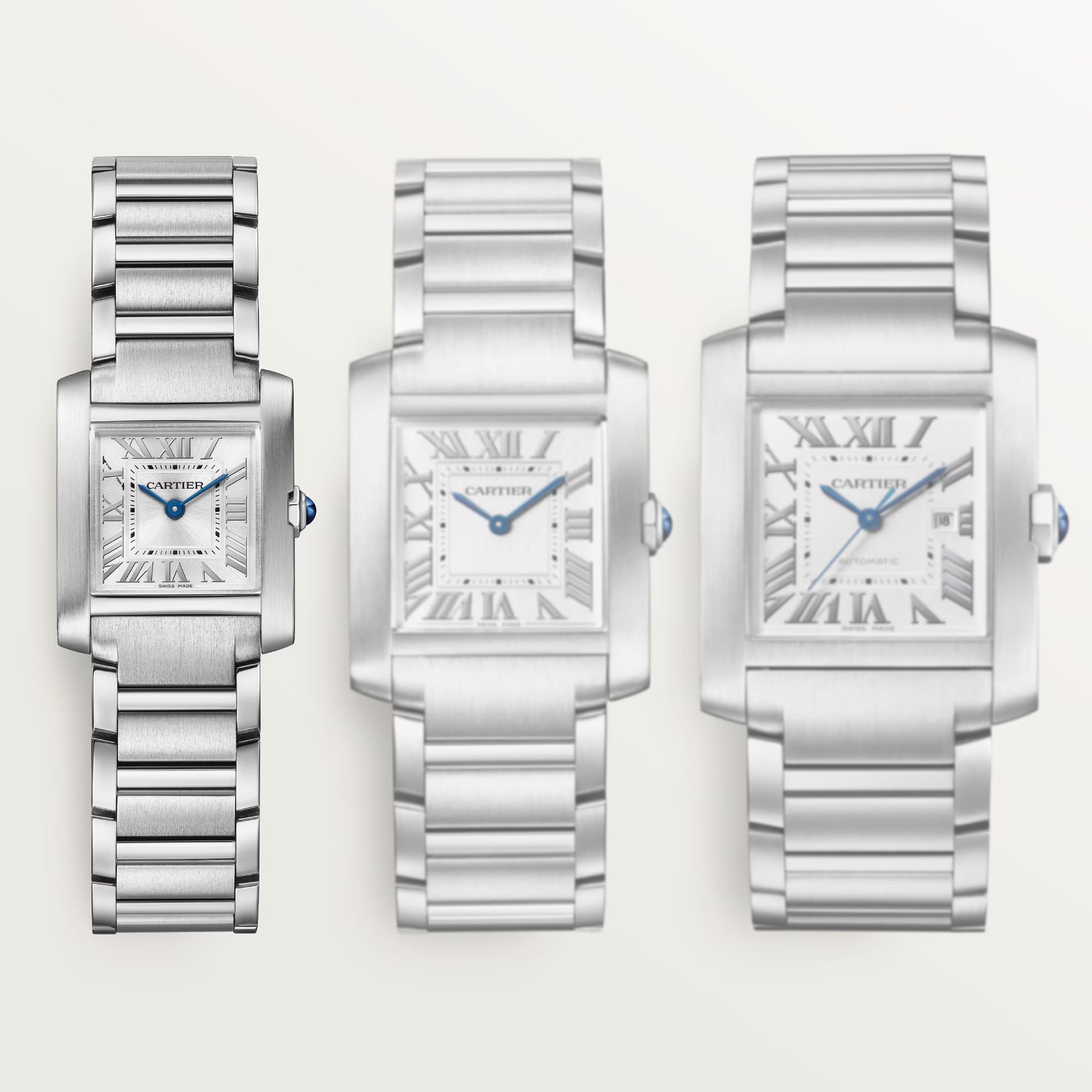 Tank Française watch, small model, quartz movement. Steel case. Faceted crown in steel decorated with a synthetic cabochon-shaped spinel. Silvered sunray dial, blued-steel sword-shaped hands, sapphire crystal. Steel bracelet. Case dimensions: 25.7 mm x 21.2 mm, thickness: 6.8 mm. Water-resistant up to 3 bar (approx. 30 meters/100 feet).